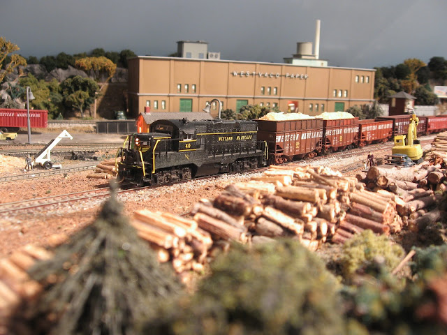Our engines are on the ready track, just east of the 20-stall roundhouse. They’ll take the inside main around behind the roundhouse and run along side our train, the West Local, which runs from Ridgeley to Elkins. This was one of two scheduled trains on the prototype Thomas Sub, the other being the East Local that originated at Elkins. We’ve got 20 empty hoppers, 4 empty boxcars, two chemical tanks and three bulkhead flats loaded with pulpwood, and two flats of machinery headed to the Sawmill in Thomas.